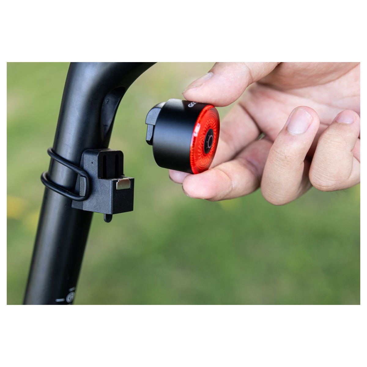 Inovatívne magnetické upnutie uľahčuje založenie aj demontáž zadného svetla z držiaka. Magnetické upnutie je ešte podporené poistným perom.