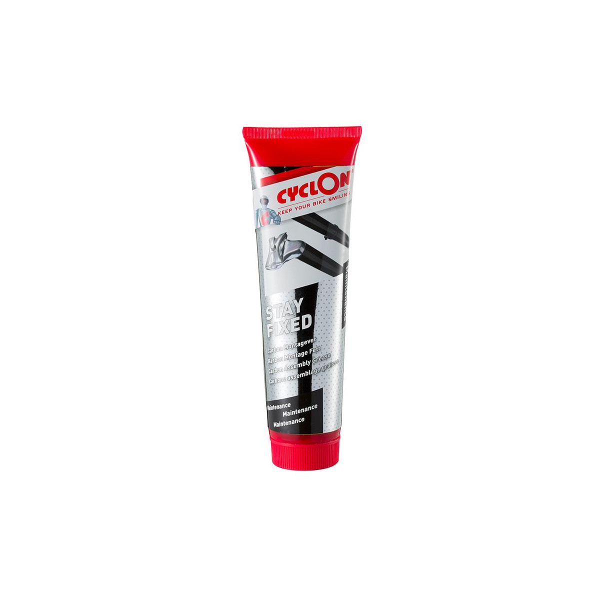 CyclOn Stay Fixed je montážna pasta na montáž karbónových dielov. Špeciálna zrnitá štruktúra CyclOn Stay Fixed zaisťuje optimálne spojenie medzi karbónovými dielmi, alebo karbónom a kovom. Malé zrná v mazive zaisťujú, že pri montáži dielov musíte použiť menšiu silu upnutia, čím sa zabráni poškodeniu pri montáži a tiež nepríjemným zvukom počas bicyklovania. CyclOn Stay Fixed sa používa na karbónovú sedlovku, predstavec, riadidlá a ďalšie karbónové diely na bicykli. Vďaka karbónovej montážnej paste sú diely chránené pred vlhkosťou a pri veľkom zaťažení nepukajú. Navyše sa vyhnete zbytočnému opotrebovaniu a diely ľahko demontujete. Pre spoje kov na kov a závitové spoje odporúčame montážnu pastu CyclOn Assembly Paste.
