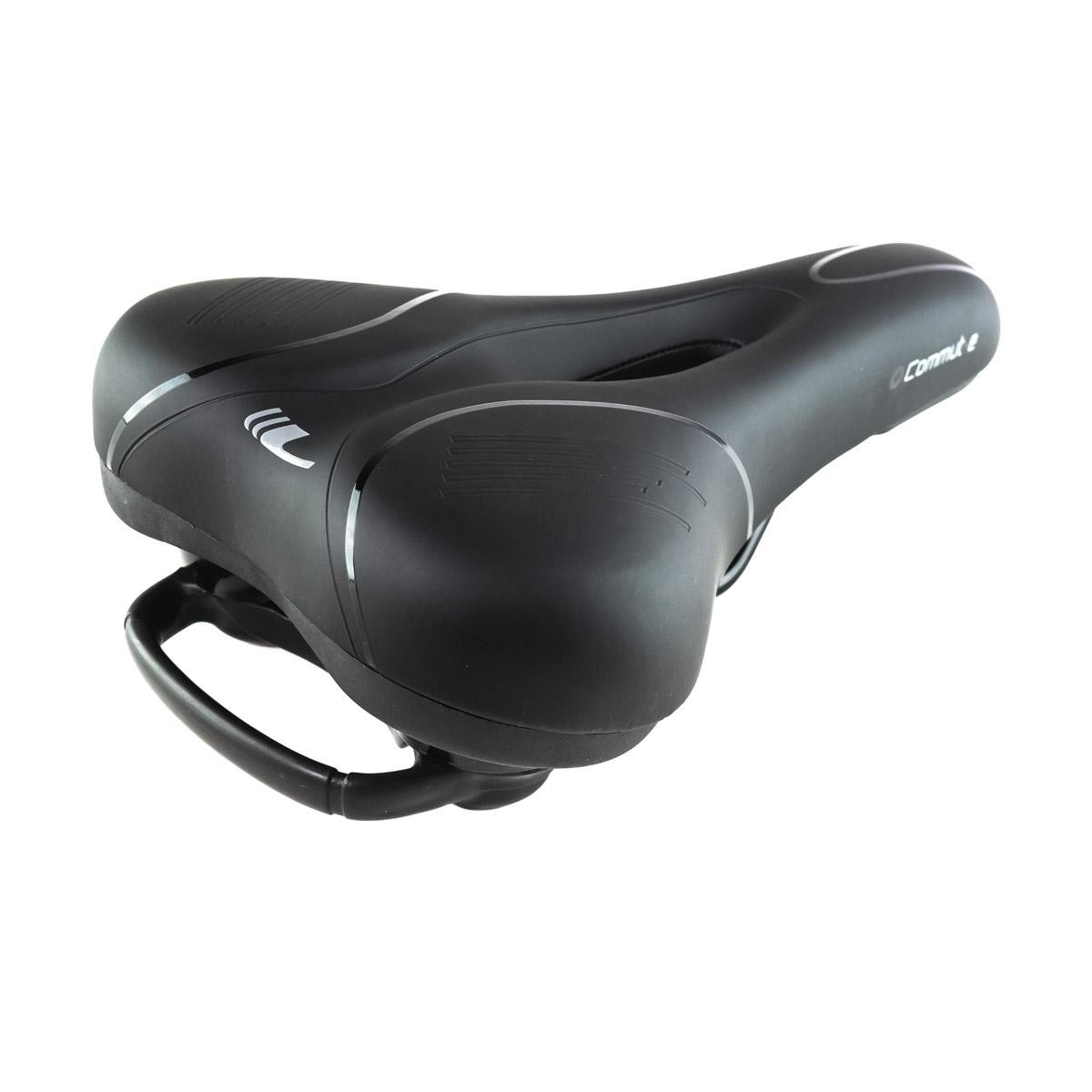 Komfortné sedlo COMUT-E je konštrukčne predurčené pre pohodlnú jazdu v mestských podmienkach a ľahkom teréne. Absolútny komfort zabezpečujú dva nezávislé pružiace systémy. Redukcia nárazového tlaku sedla a absorbcia nárazov sedla na sedacie kosti je zabezpečená umiestnením vrstvy pamäťovej peny, ktorá rozkladá tlak na väčšiu plochu a prispôsobuje sa tvaru tela. Pod ňou umiestnená vrstva peny s vyššou hustotou zabezpečuje tlmenie vibrácií a zvyšuje stabilitu. Znížený stredový pás a stredový otvor redukuje tlak v oblasti medzi sedacími kosťami a zvyšuje odvetranie. Druhý systém je umiestnený pod sedlom, kde väčšinu vibrácií od kolesa zachytí vnútorná vinutá pružina a zostatok vonkajší elastomer. Elastomer prekrýva pružinu, takže sa nemusíte báť zacvikvutia prstov alebo predmetov v pružine. Súčasťou pružiaceho systému je aj madlo, ktoré umožňuje pohodlné ochopenie bicykla. Odolný zvršok zabraňuje pokĺznutiu na sedle počas jazdy. Pevné oceľové koľajničky zvyšujú životnosť sedla. Rozmer 278 x 188mm Odporúčaný sklon pri jade: 90° Váha: 685g