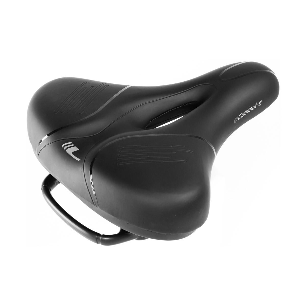 Komfortné sedlo COMUT-E je konštrukčne predurčené pre pohodlnú jazdu v mestských podmienkach a ľahkom teréne. Absolútny komfort zabezpečujú dva nezávislé pružiace systémy. Redukcia nárazového tlaku sedla a absorbcia nárazov sedla na sedacie kosti je zabezpečená umiestnením vrstvy pamäťovej peny, ktorá rozkladá tlak na väčšiu plochu a prispôsobuje sa tvaru tela. Pod ňou umiestnená vrstva peny s vyššou hustotou zabezpečuje tlmenie vibrácií a zvyšuje stabilitu. Znížený stredový pás a stredový otvor redukuje tlak v oblasti medzi sedacími kosťami a zvyšuje odvetranie. Druhý systém je umiestnený pod sedlom, kde väčšinu vibrácií od kolesa zachytí vnútorná vinutá pružina a zostatok vonkajší elastomer. Elastomer prekrýva pružinu, takže sa nemusíte báť zacvikvutia prstov alebo predmetov v pružine. Súčasťou pružiaceho systému je aj madlo, ktoré umožňuje pohodlné ochopenie bicykla. Odolný zvršok zabraňuje pokĺznutiu na sedle počas jazdy. Pevné oceľové koľajničky zvyšujú životnosť sedla. Rozmer 255 x 217mm Odporúčaný sklon pri jade: 90° Váha: 720g