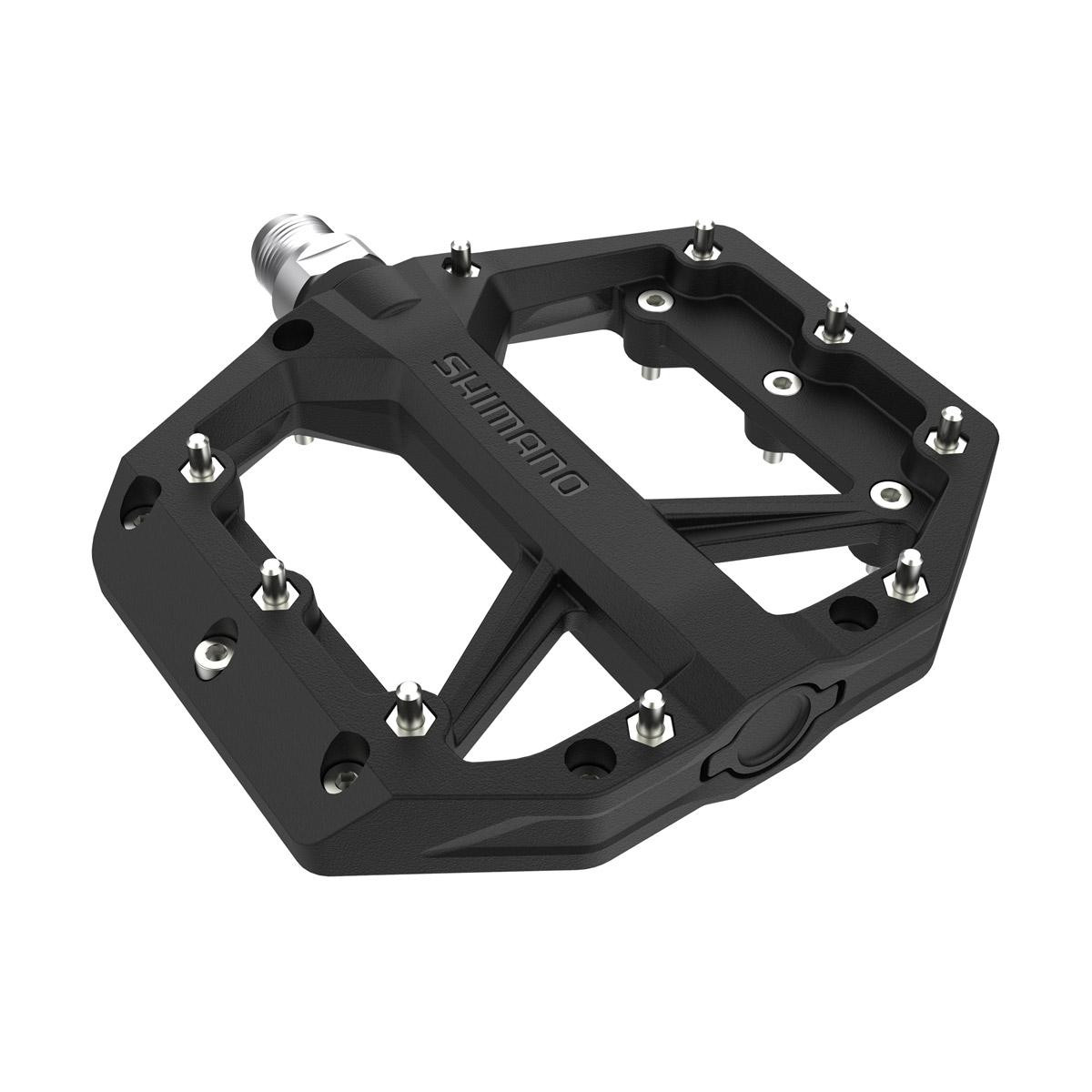 Pedále MTB PD-GR400 bez zámku. Odolné pedále typu Flat pre rôzne jazdné štýly v teréne. Široký tvar pedálu pre lepší komfort, stabilitu a účinnosť šliapania do pedálov. Veľkosť platformy 101x96mm. 9 vymeniteľných pinov na každej strane. Kompozitové telo a oska s odolnou a tuhou konštrukciou. Typ: MTB, Celková váha balenia: 562g, Použitie: Enduro/Trail, obojstranné, Flat, čierne, Materiál: telo pedálu (kompozit), oska (chróm+oceľ)