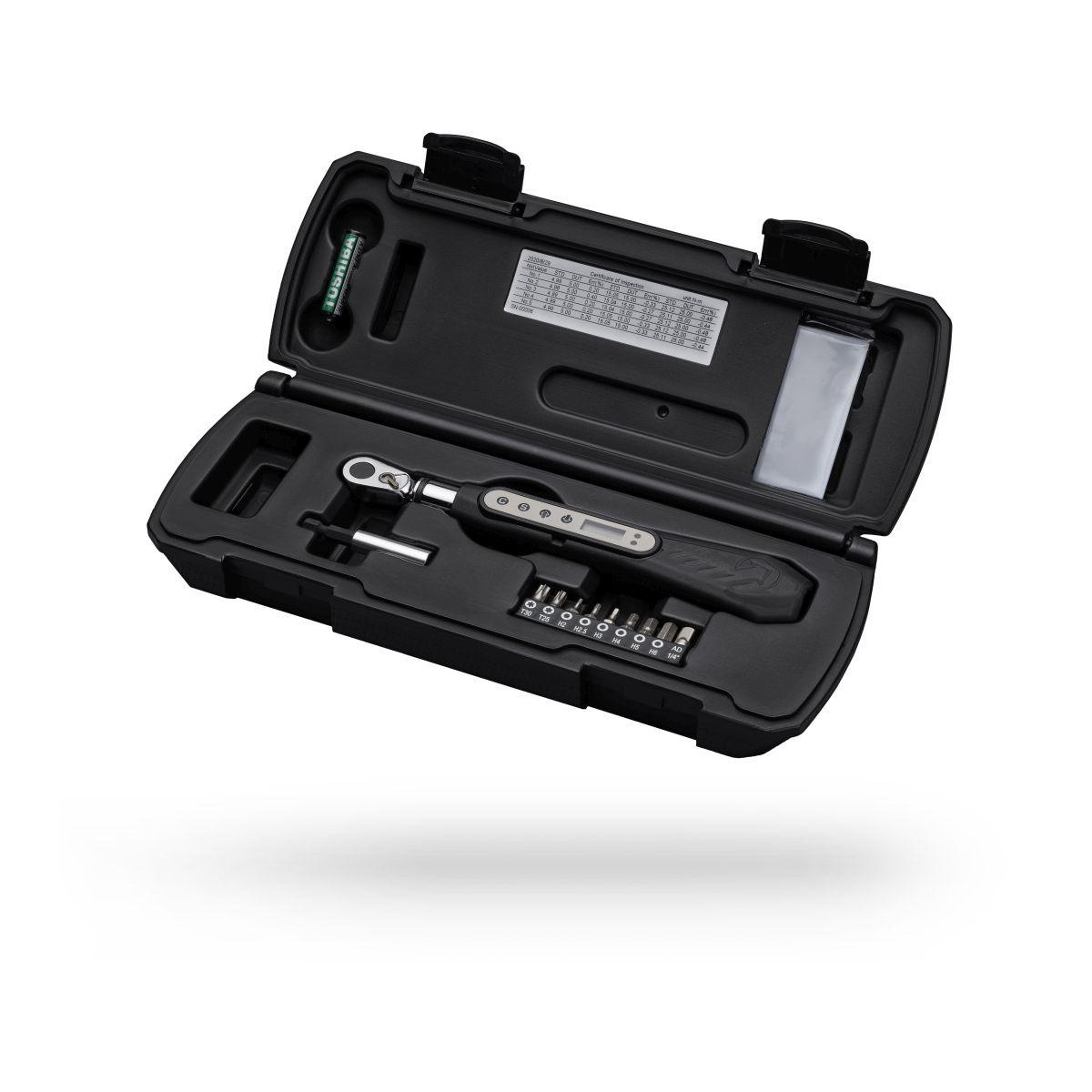 Precízny momentový kľúč s LCD dispejom. Možné nastaviť takmer všetky momenty potrebné pre cyklistiku. Optická a akustická signalizácia pre bezpečné nastavenie. Nastaviteľné hodnoty: N-m, ft-lb, in-lb, kg-cm. Vymeniteľné batérie. Balenie obsahuje pevný obal, nástavce: M2, M2,5, M3, M4, M5, M6 , T20, T25 a 1/4" adaptér.