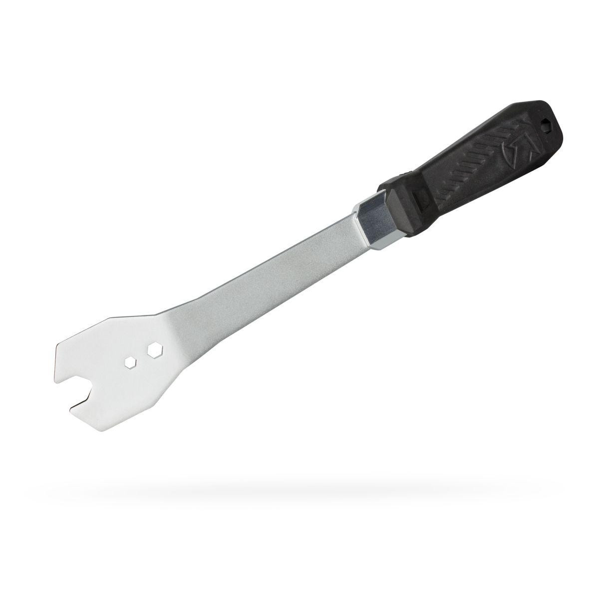 Prémiový kľúč na pedále. Vyrobený z extra odolnej tepelne spracovanej ocele. Laserom vyrezané pre optimálnu presnosť. Ergonomický úchop z dvojzložkovej gumy. Predĺžená rúčka pre optimálny pákový efekt. Kompatibilný s 15mm maticou pedálu. Kompatibilné s pedálmi s upevnením na 6mm a 8mm šesťhrany.