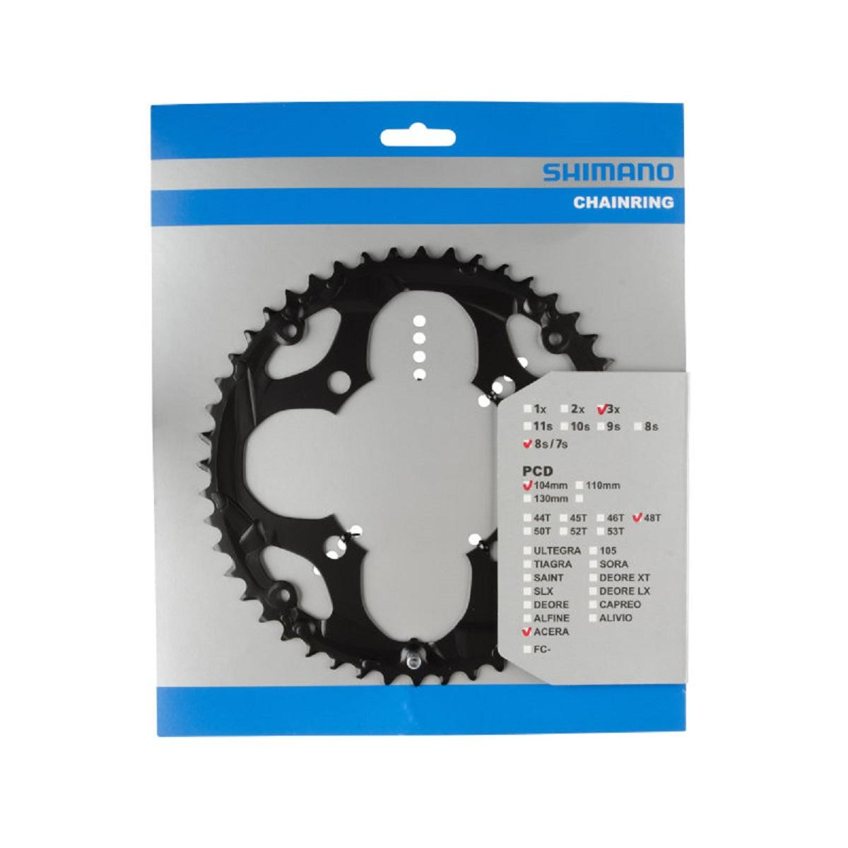 Veľký prevodník Acera 48 zubov pre kľuky FC-M361. So špeciálne tvarovanými zubami a s reťazami systému HG zabezpečí vynikajúcu úroveň radenia. Typ: MTB, Celková váha balenia: 265g, Počet zubov na prevodníku: 48, Prevodníky: 7/8 rýchlostné, Pre kombináciu prevodníkov: 48/38/28, Počet prevodov: 3x7/8, Rozteč prevodníkov: 104mm, čierny
